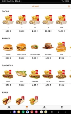 Menu Varié : Burgers, grillades, kebabs, tacos, sandwiches et pâtes.