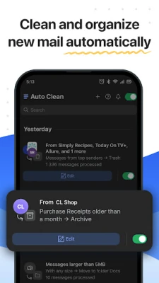 • Use AUTO CLEAN RULES to process, filter, and sort your incoming emails automatically — quickly archive old emails, keep only the newest messages, and more.