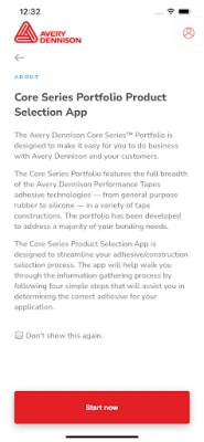 The Avery Dennison Core Series™ Tape Selector App makes it easy to find the adhesive best suited for your application. By following four simple steps, you will be able to quickly define product recommendations for your application. The Tape Selector App also simplifies the process of obtaining the technical information on the selected products and requesting samples for application development.
